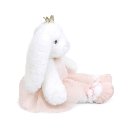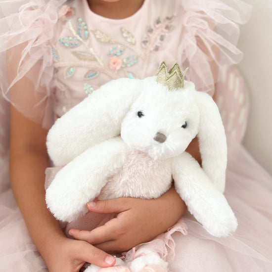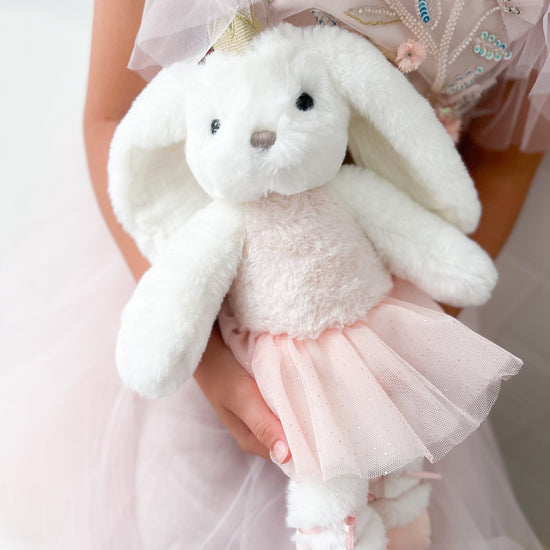 Behold the presence of Ashley Ballerina Bunny! Our premium fur bunny ballerina, an essence of grace and charm. Adorned with a gold crown atop her delicate ears. Her ensemble is a symphony of sophistication; a tutu cascades around her form. Upon her dainty feet, she wears satin ballerina slippers.