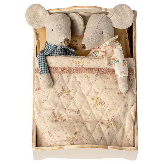 The perfect bed for a good nights sleep. This bed has beautiful small details such as golden finish on the wood and beautiful collected fabrics for bedlinen. Two mice can easily sleep side by side as it fits big sister/brother mice.