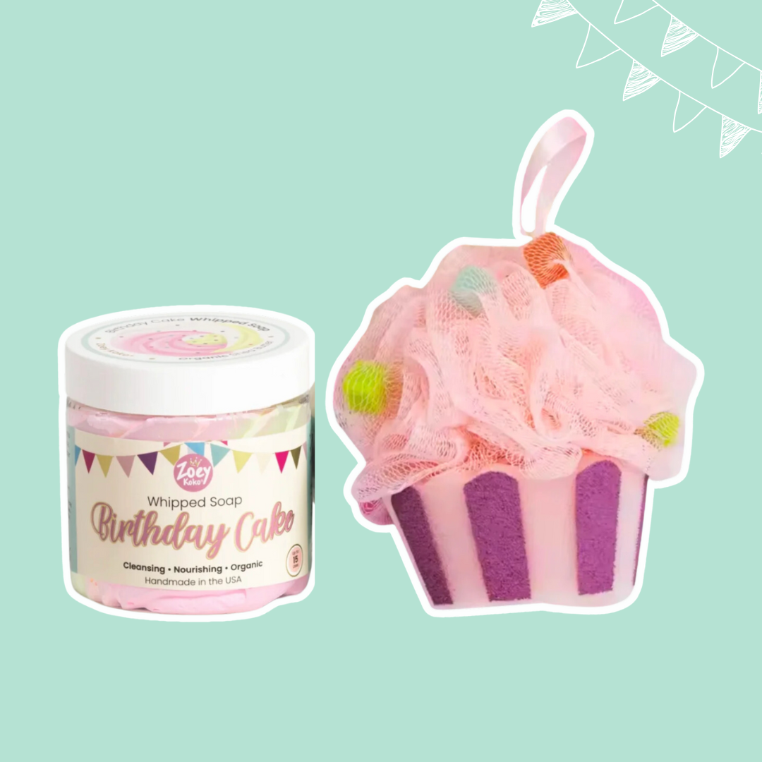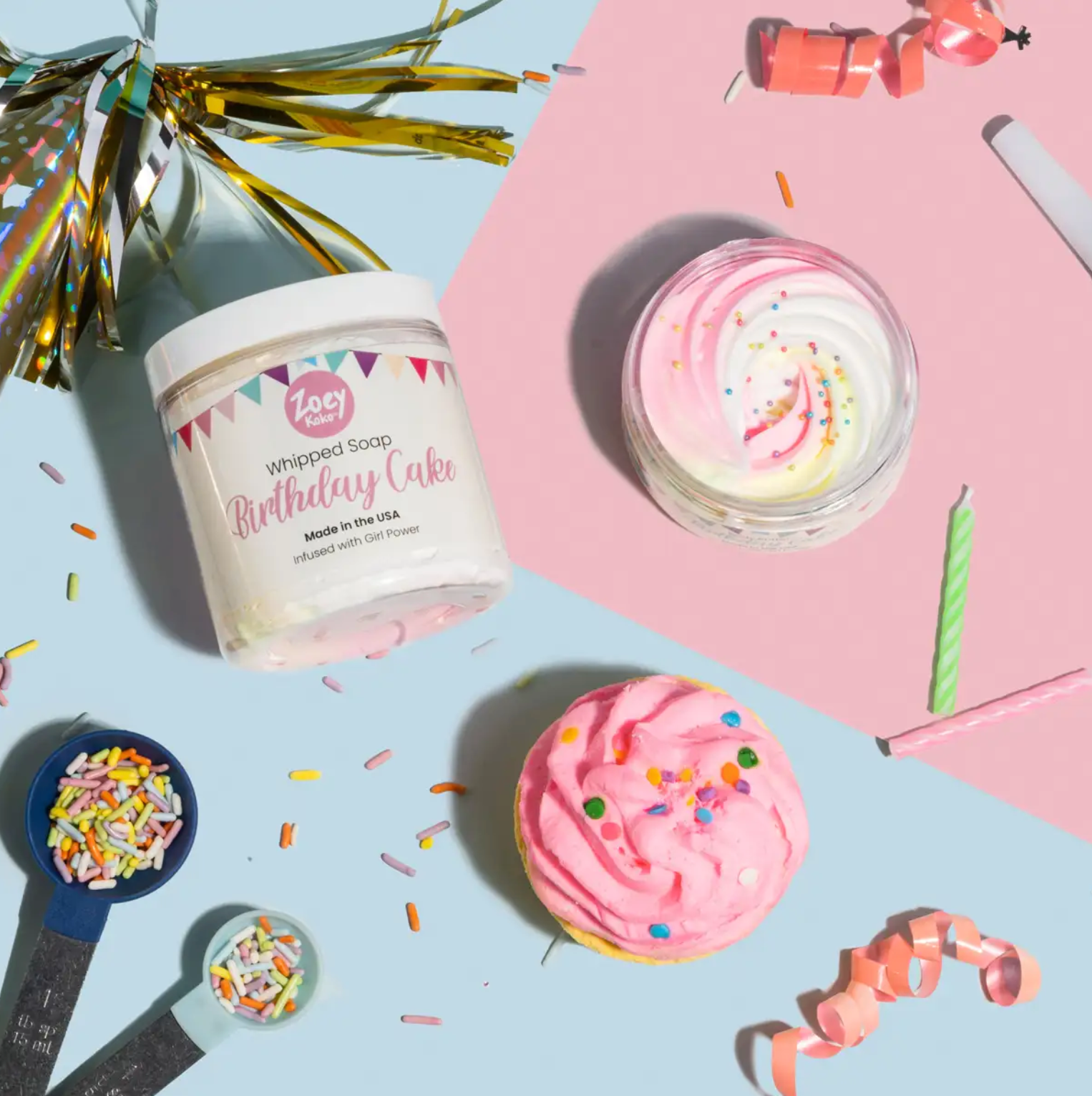 - Birthday Cake Whipped Soap (4 oz): A fluffy, birthday cake-scented whipped soap that suds into creamy bubbles, leaving skin soft and smelling deliciously sweet.