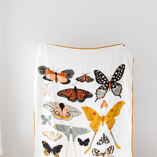 One side of our Butterfly Throw, you'll find a collection of colorful and cute butterflies and the other is a warm mustardy yellow.