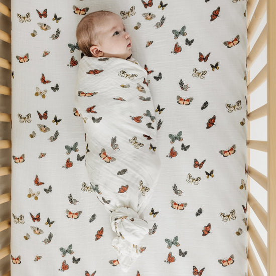 Butterfly in the skyyy, I can go twice as high. Take a look, our Butterfly Migration Crib Sheet has our hearts all a flutter. Our comfy cozy crib sheets look adorable in your nursery and keep your little one the perfect temperature and sleeping conformably.