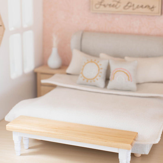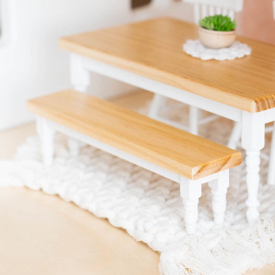 The miniature detail on this bench is absolutely dreamy! It is the perfect match to our classic dining table. The white spindle legs paired with the natural wood top make it a timeless pairing! We also love to style it at the end of a cozy tiny bed.