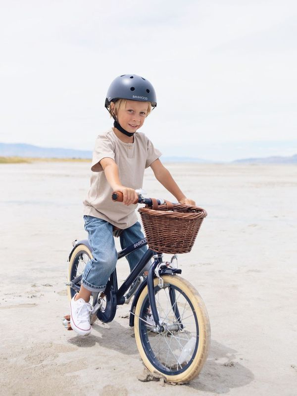 Inspired by vintage bicycles for adults and influenced by Scandinavian design, the Banwood Classic features a lightweight alloy frame in navy finish. And your mini me cyclist will be the coolest kid on the block with the bike sporting Banwood’s brown faux leather saddle and grips in matching colors, Banwood’s unique rosewood vintage pedal, cream 16” tires and a detachable wicker basket in rattan – perfect for packing in the essentials (think lunch, water bottle and favorite toy!) for a day’s adventure.