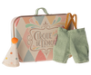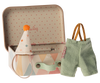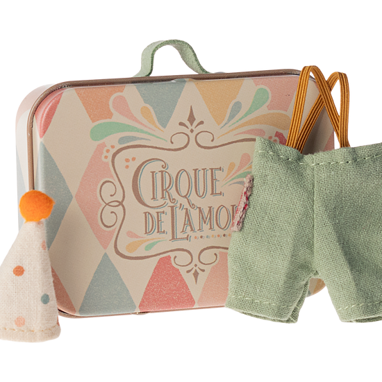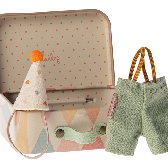 Make your little brother mouse the life of the party with this fabulous Maileg clown clothes set. It comes complete with suspenders, pants, and a hat, all neatly packed in a small metal suitcase for convenient transport.