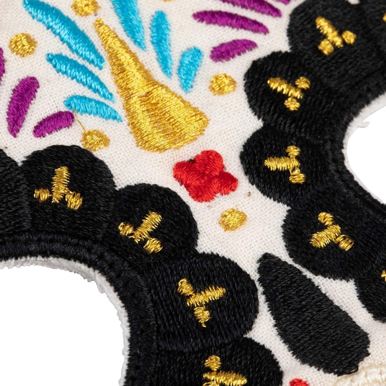The mask is made of cotton and features a one-of-a-kind intricately embroidered design.