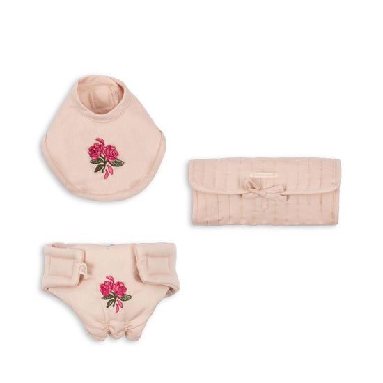 Make playtime extra special with this adorable nursery set, perfect for your child’s favorite doll. The set includes a bib, a diaper with a secure Velcro closure, and a soft cotton cloth, encouraging imaginative play and nurturing skills.