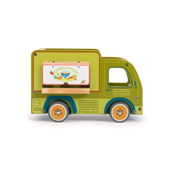 Ding-dong! The Big Family's food truck is ready to serve up tasty bowls of soup and homemade sandwiches! Made entirely of wood and fully illustrated, its wheels turn and its window opens to serve customers.