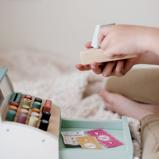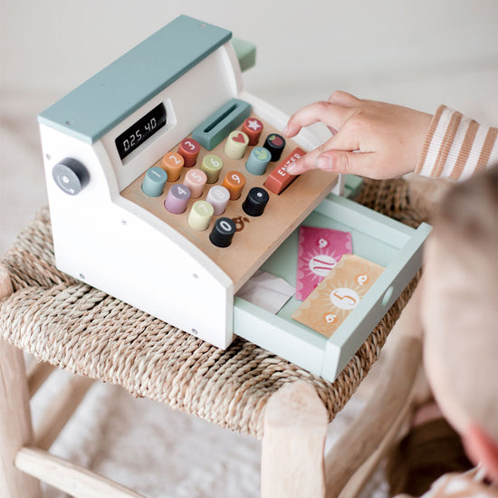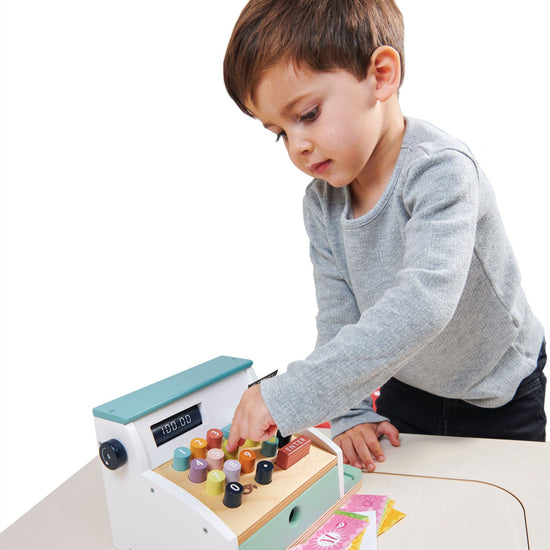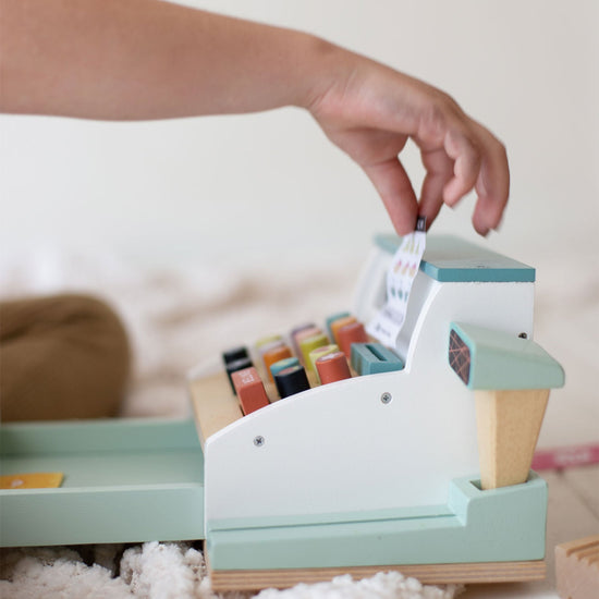 Ring up all your groceries with this fun and colorful wooden till with scanner. Slide your credit card along the groove, pop one of 5 printed receipts into a slot, turn the little knob to show different prices through a window, press down on the multi-colored squidgy buttons and open the tray to dispense 5 wooden coins and 9 sheets of colored paper money.
