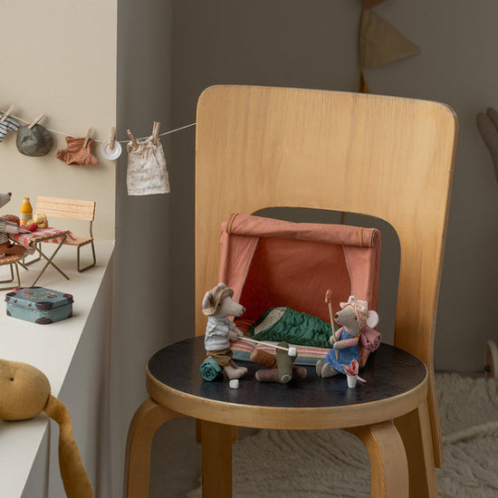 Take your mice for a sleepover in the fold-up tent. The wooden sticks can hold the tent door up and give shelter from the rain. The outer fabric has a coated surface for a more authentic look. Remember to ask them to bring their sleeping bags.