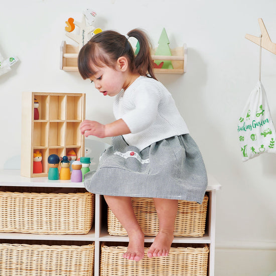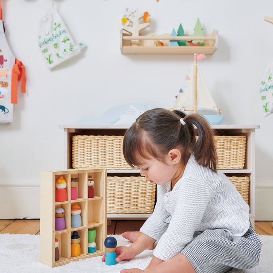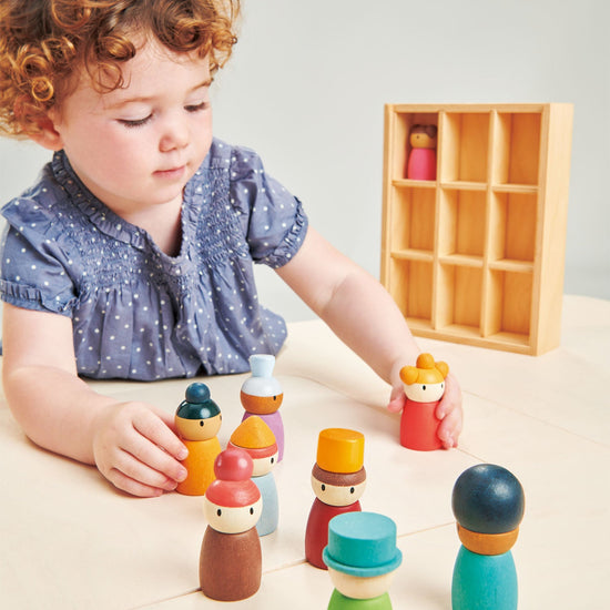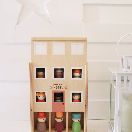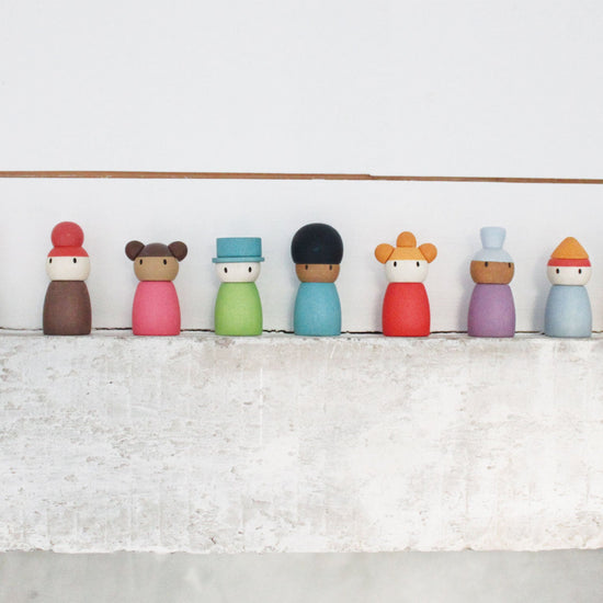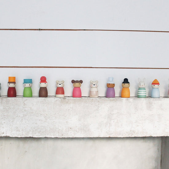 Part of our open-ended play, meet the 9 folks who reside at the happy hotel. Made from solid wood, colored with a soft water based stain, they can represent anyone you know. These little people are perfect for adding to any sort of creative or imaginative play, and can be perched easily on any surface.