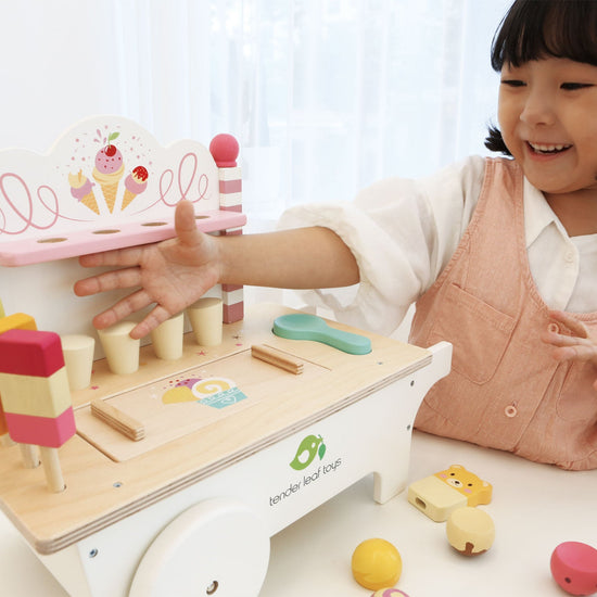 Who doesn't love an ice cream? A gorgeous wooden push along cart on wheels, with 4 wooden ice lollies, 4 cornets, 4 magnetized colorful ice creams, a magnetic ice cream scoop and a removable lid to reveal tubs on the underside. All painted in the most gorgeous yummy colors and great for shared pretend play.