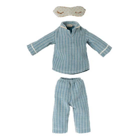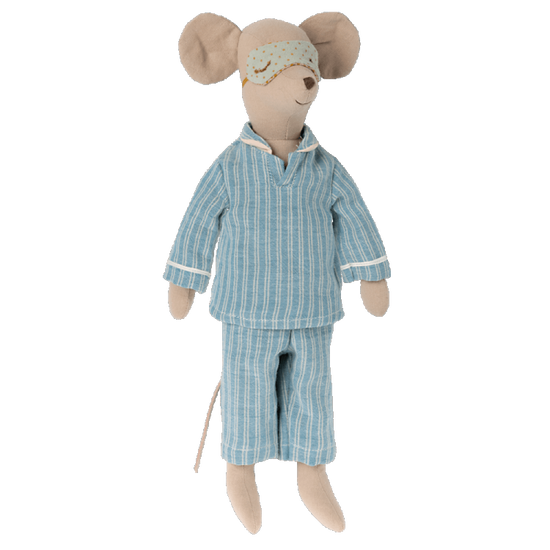 Medium Mouse in Pyjamas wears a sleepy blue two-piece pajama set with off-white stripes. He likes to sleep in his mint mask with sleepy eyes stitched on, for extra relaxing rest. Medium mouse makes a comforting rest-time companion, and loves to cuddle.