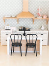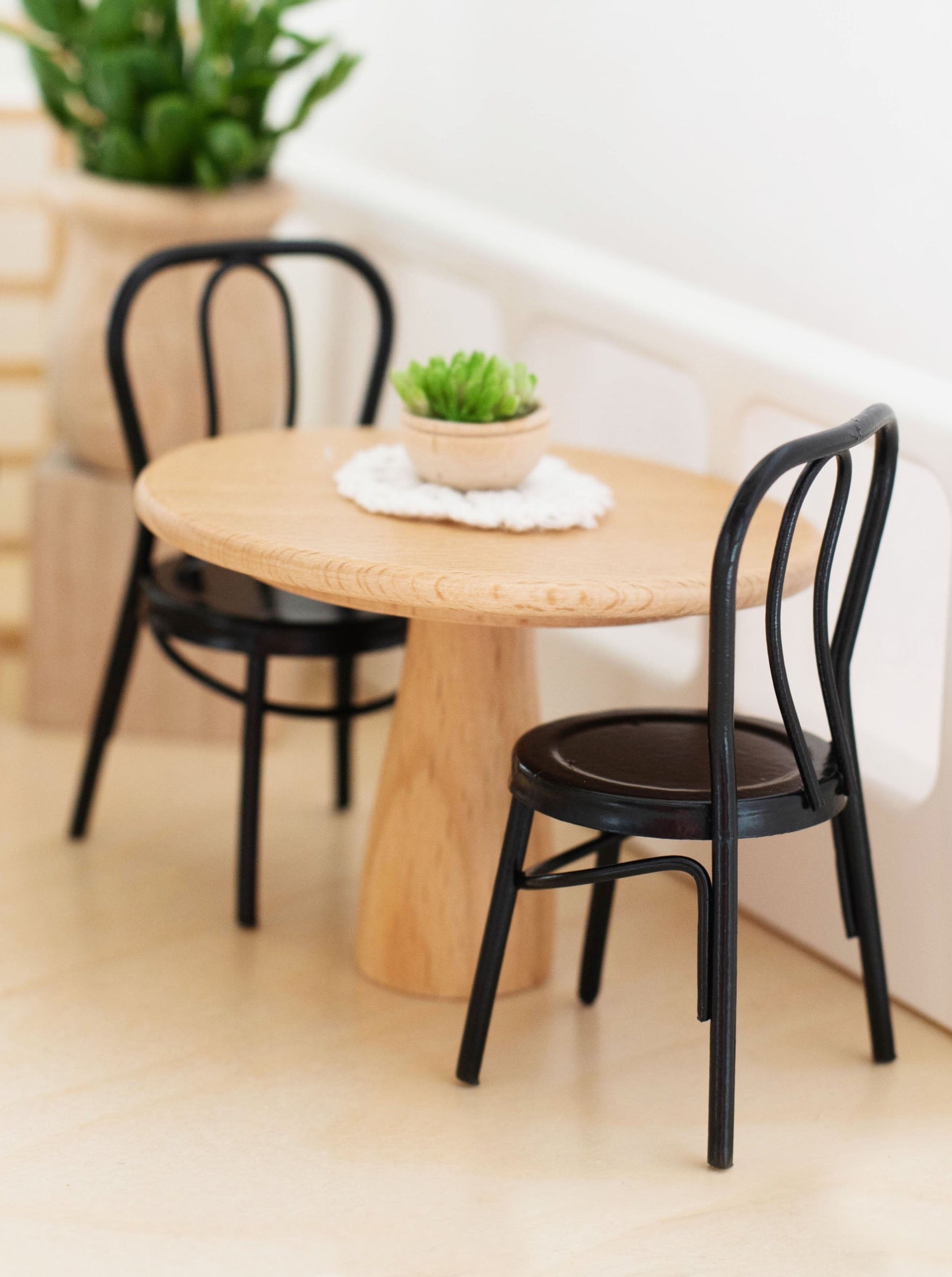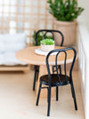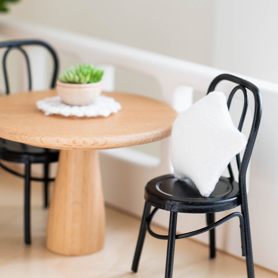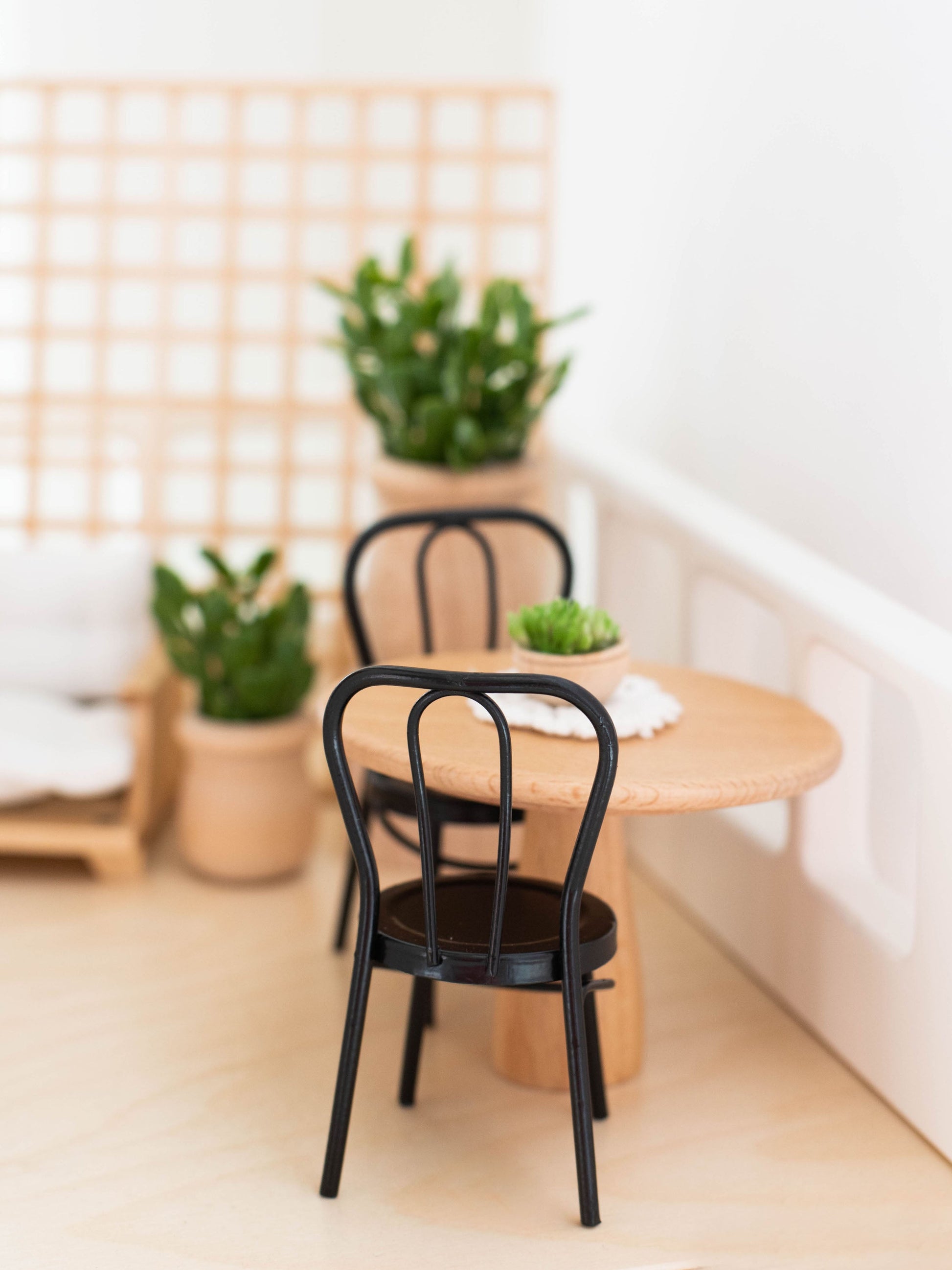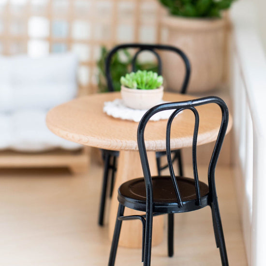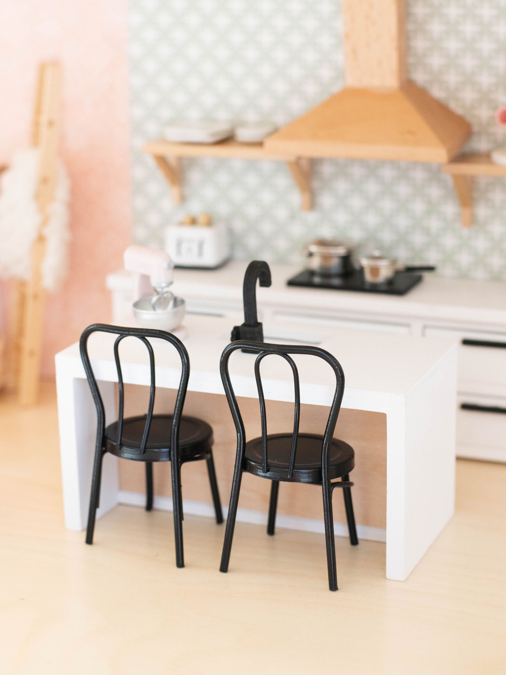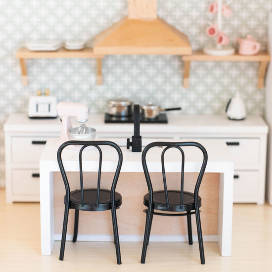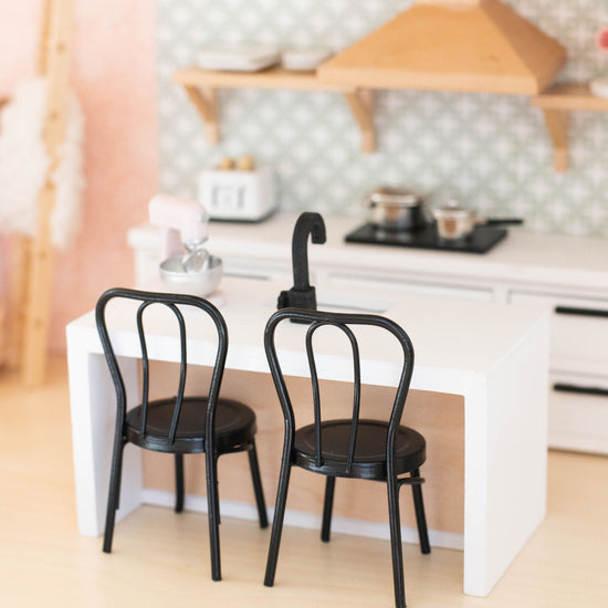 Our metal bistro chairs are intricately designed and timeless. Pair them with our bistro table, or bring a look of elegance to our classic dining table. The sturdy metal construction ensures durability, making them a lasting addition to your miniature collection.