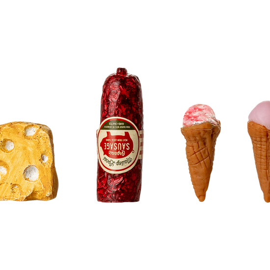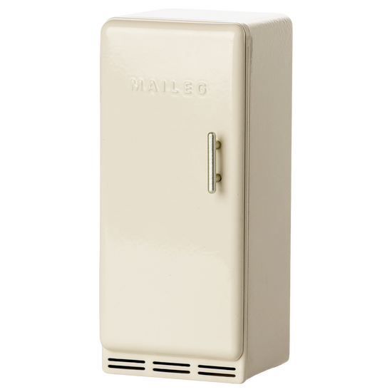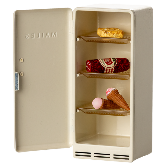 An old fashioned fridge that fits perfectly into the Maileg Mouse hole Farmhouse. Inside the metal fridge you will find:
