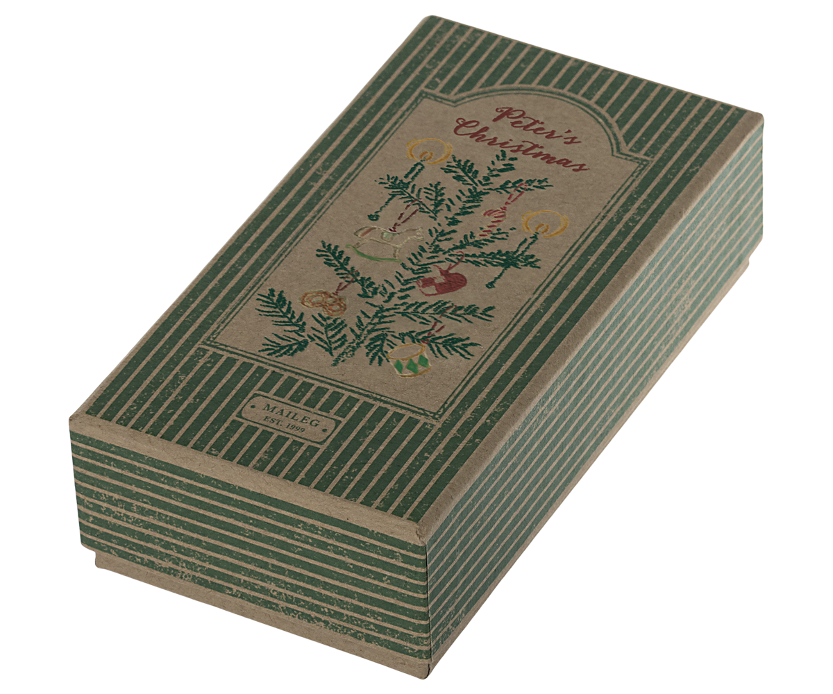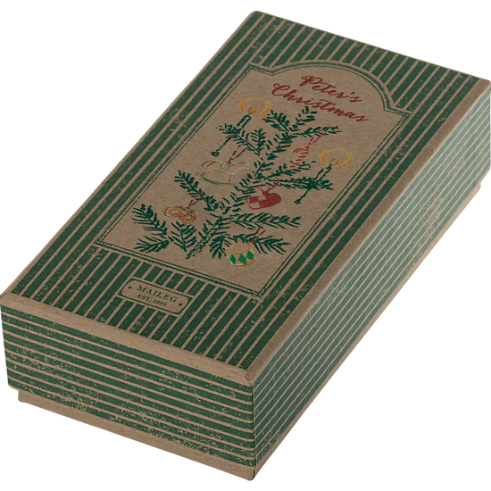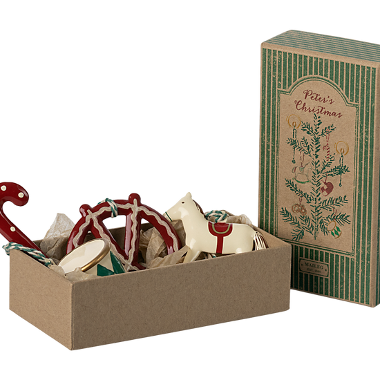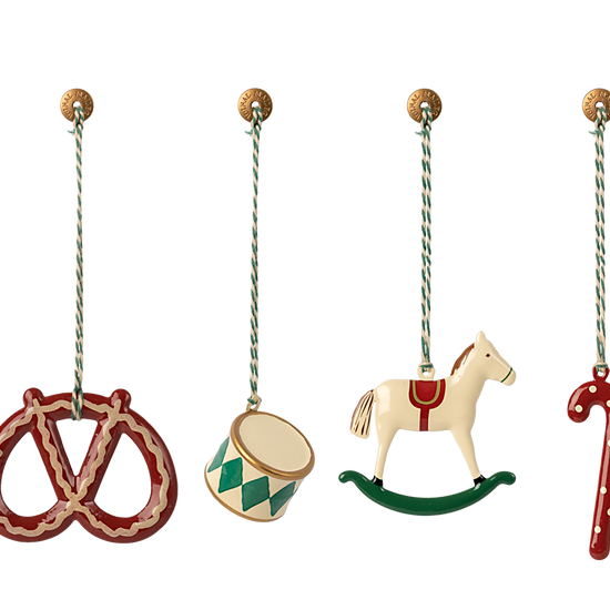 A perfect gift box containing 4 beautiful Maileg ornaments. Each ornament is wrapped in tissue paper and packed together in a gift box decorated with Dorte Mailil's drawings. This set contains a drum, sugarcane, pretzel and a rocking horse.