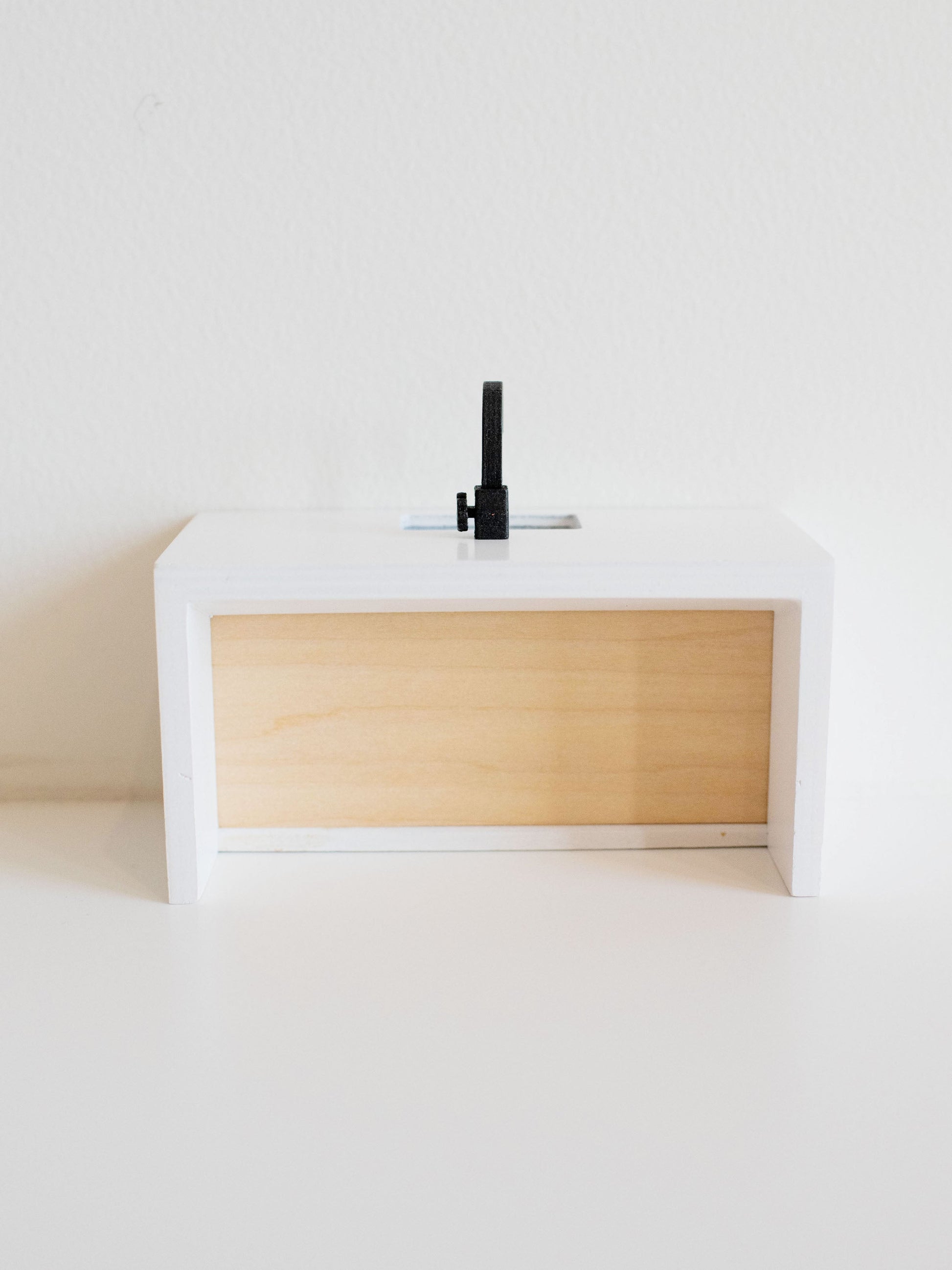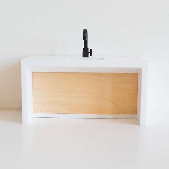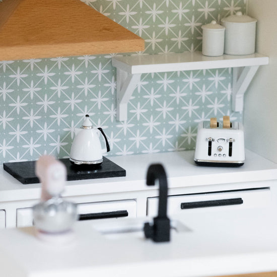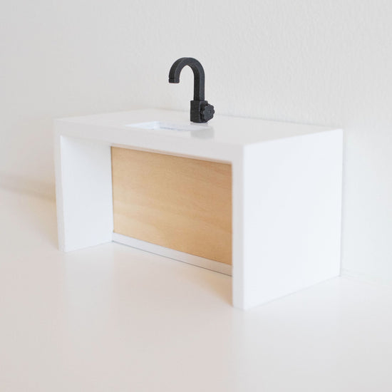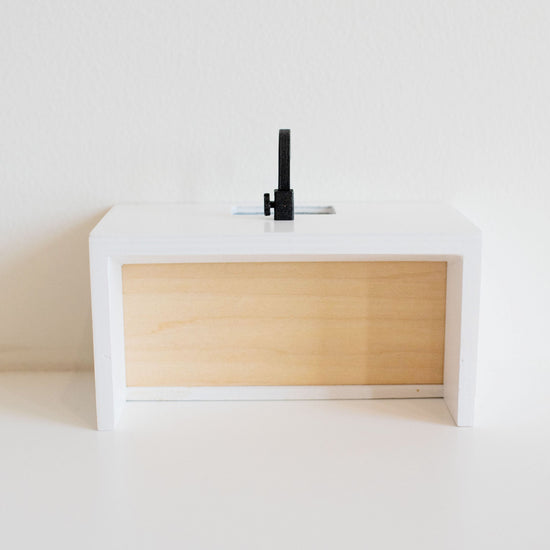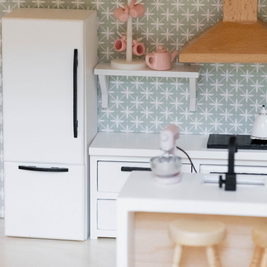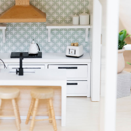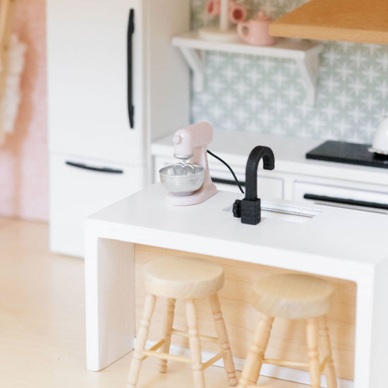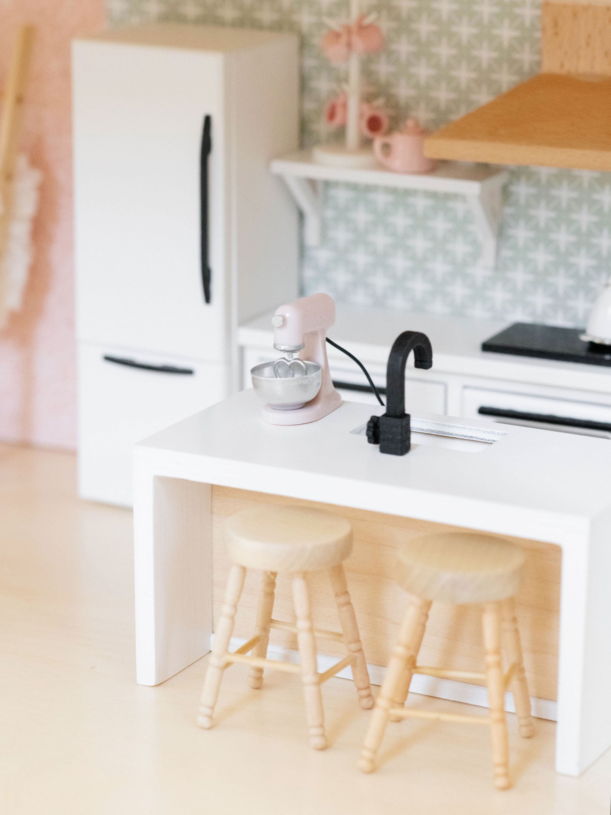 When it comes to the heart of any home, no other feature feels as modern as adding in a miniature island. Stunningly beautiful center island with wood front/back, sleek white waterfall edge, and modern black wood faucet. Place a couple of barstools so your miniatures can converse while prepping meals and doing dishes!