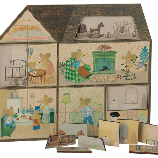 The wooden puzzle comes with 31 puzzle pieces without interlocking. The illustration is hand drawn by Dorthe Mailil and shows 7 different rooms in the Mouse hole Farmhouse. The puzzle has the graphic printed on the ground plate as well.