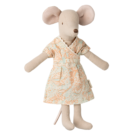 A classic Maileg item; Mum mouse in a light dress. This mouse fits furniture and accessories in size mouse. Buy more clothes separately. Clothes in size mum/dad fits this mouse.