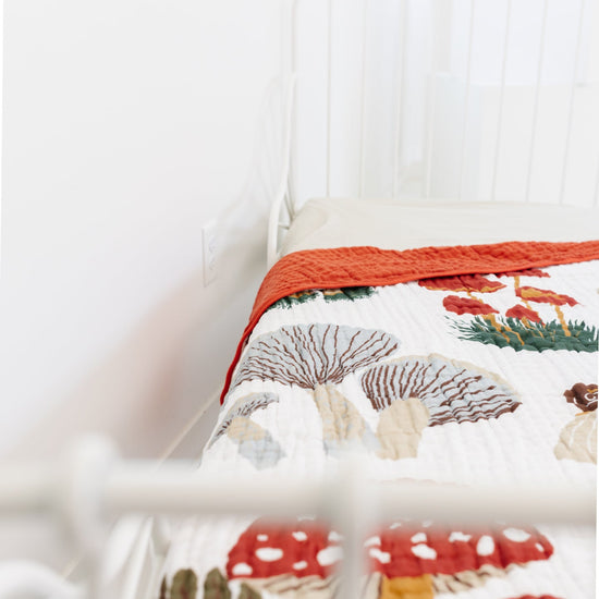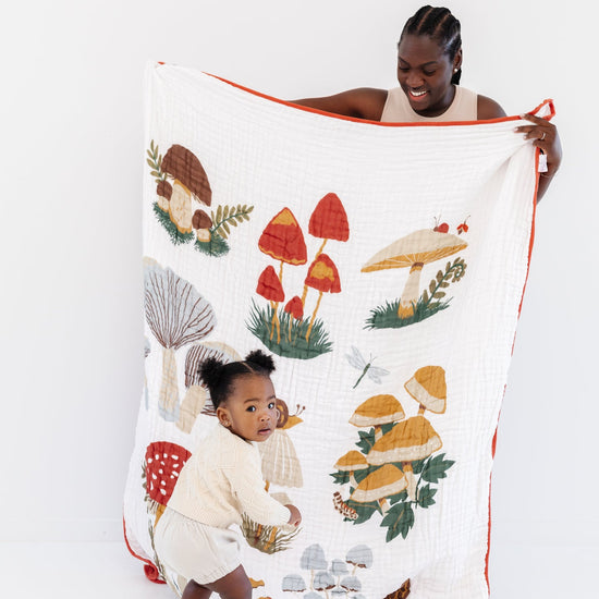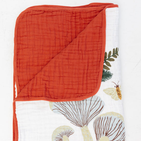 Our throw Blankets are perfect for big kid beds (they will fit nicely on a twin!) or curling up with a cutie and getting cozy on the couch. On one side, you'll find an assortment of the cutest mushrooms you can forage and on the other, a cheerful and rusty red color.