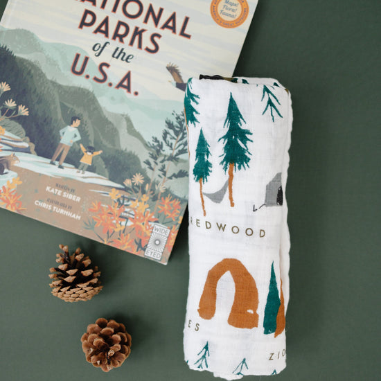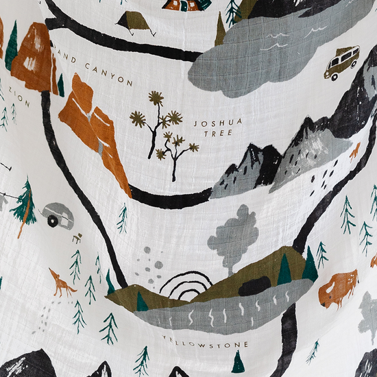 National Parks Swaddle is the perfect companion for any outdoor adventure. It features some of our favorite National Parks including: Yellowstone, Yosemite, Grand Teton, Rocky Mountain, Volcanoes, Joshua Tree, Redwood, Arches, Zion, Glacier, and Grand Canyon.