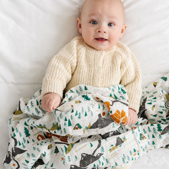 We took our National Parks print and made it mini! Take it anywhere because this swaddle is the perfect companion for any outdoor adventure. It features some of our favorite National Parks including: Yellowstone, Yosemite, Grand Teton, Rocky Mountain, Volcanoes, Joshua Tree, Redwood, Arches, Zion, Glacier, and Grand Canyon.
