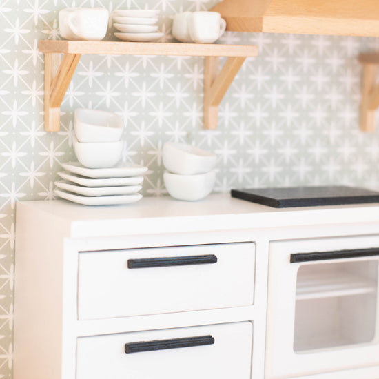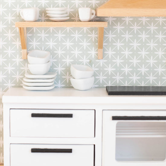 A classic dishes set for your miniature world. Serve countless pretend tiny meals on these dishes. They're adorable for displaying on open shelving in your miniature kitchen!