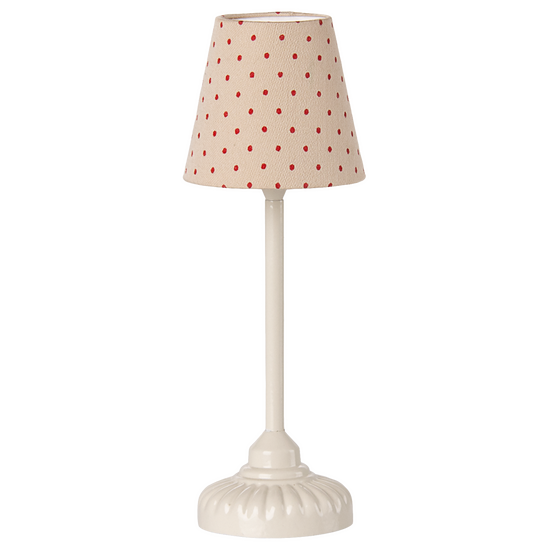The beautiful Maileg vintage floor lamp is a must-have. The lamp will light up the room with a soft tone - remember to turn off the light when our friends go to bed. The product comes without battery. You can add a coin cell battery (CR2032).