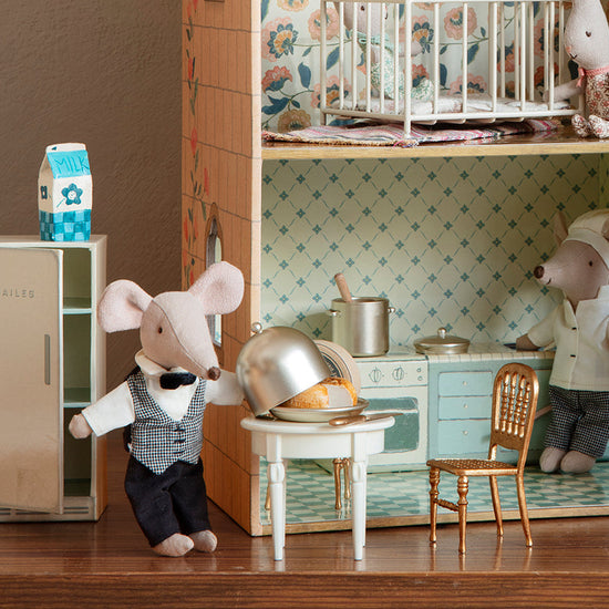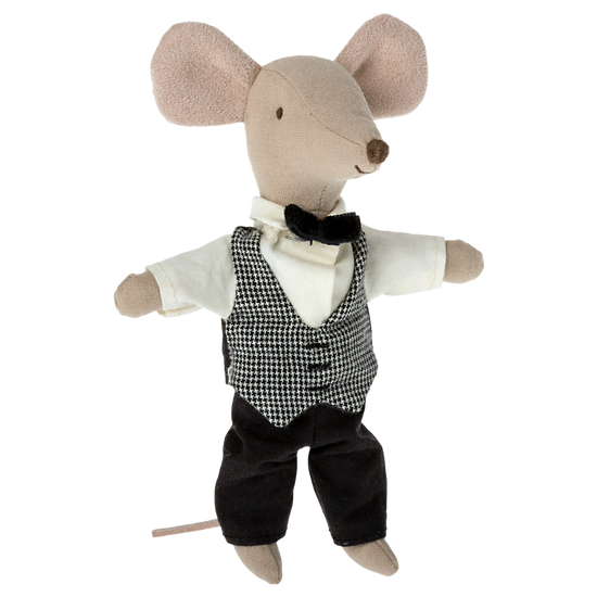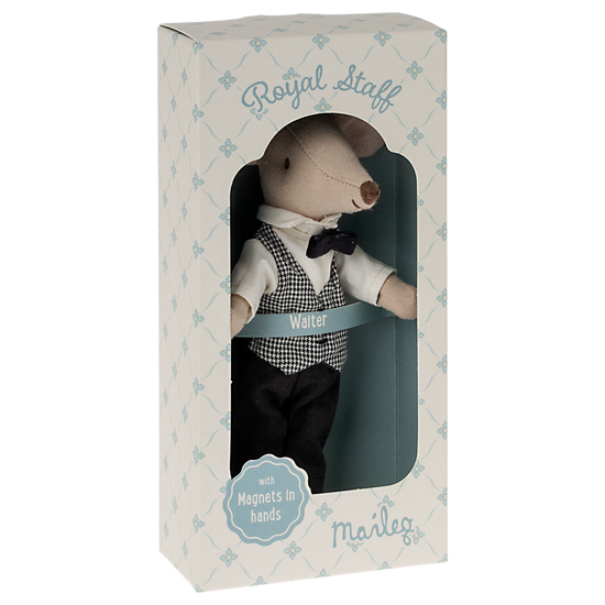 The waiter mouse is the perfect helper at any party or for the royal family anytime. Our Waiter mouse is dressed classically and has magnets in the hands, so it is easier to hold all metal utensils, such as our cheese bell.