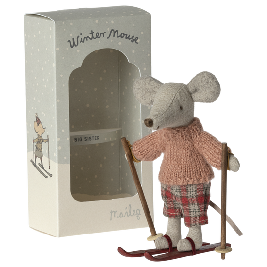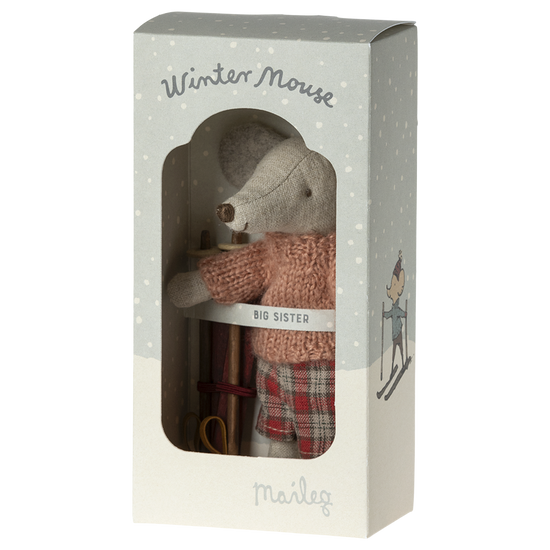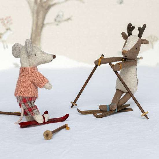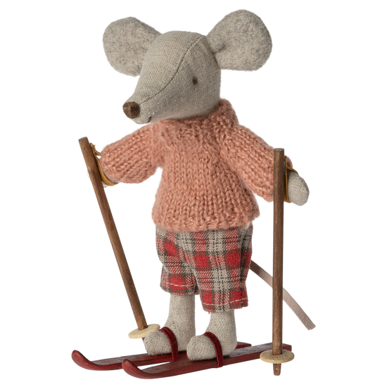 A mouse ready for hours of fun on the slopes during the cold wintertime. Each playset contains a warmly dressed mouse with a pair of ski and poles. A funny detail is the ears which are made so they look like the mouse is wearing ear warmers.